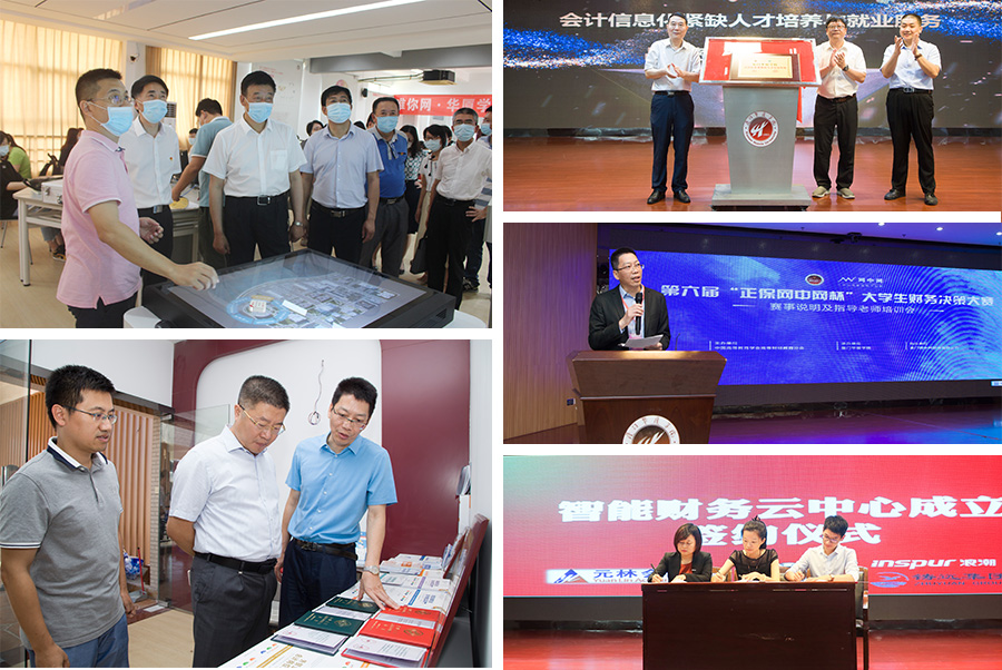 左上:临夏州常委参访智慧财商工场;左下:省评估中心主任视察专业建设成果;右上:产教融合培养财会紧缺人;右中:数字化专业竞赛——财务决策大赛全国师资培;右下:数字化资源赋能教学改革——校企共建智能财务云中心
